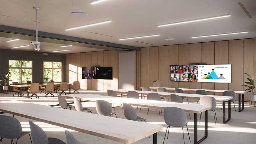 Scale repeatable multi-purpose spaces with a streamlined setup that eliminates custom programming and multi-vendor hardware complexities—all powered by Room Kit Pro G2.