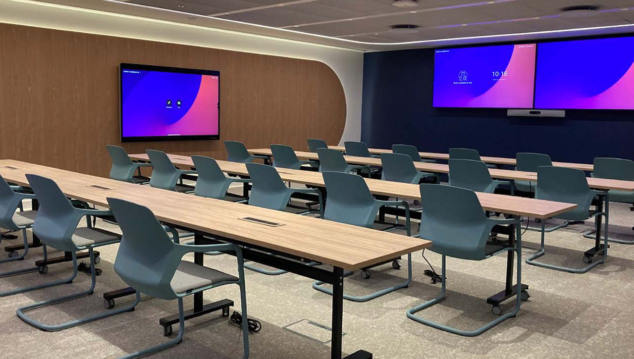 A classroom-style composition combined with multiple screens and a quad-lens camera system offers an optimal blueprint for local, remote, and hybrid presentations.